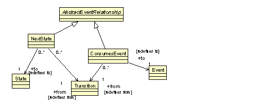 The Transition class represents a transition that is performed when a certain event is consumed is a certain state. Transition element should be owned by some state element. Transition can be associated with the corresponding Event by using the "ConsumesEvent" resource relation. A transition element can also own some Event elements. Transition does not have an "implementation" group. Instead, it is considered as some sort of a trigger. The association between the transition and corresponding behavior is achieved through the "abstraction" action container of the transition. Usually, this is a Calls action relation. For more complex situations, the "CodeGroup" capability of the "abstraction" action element can be used.